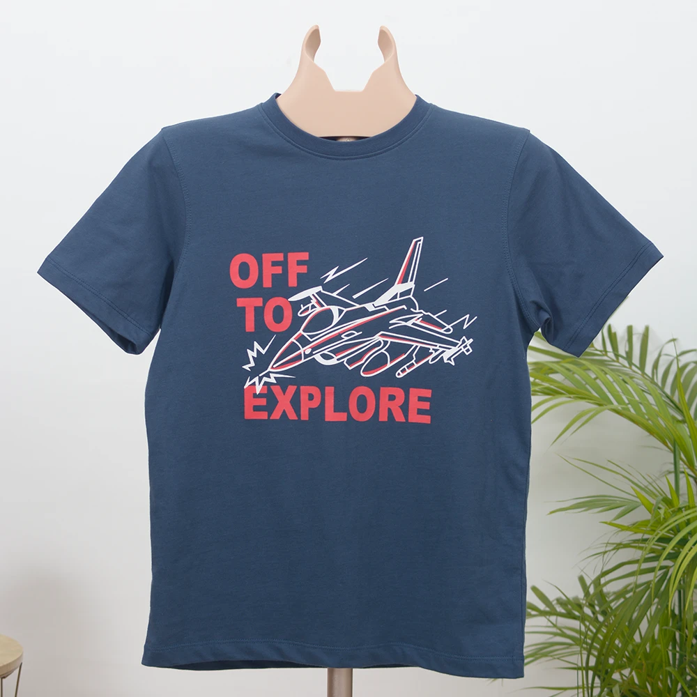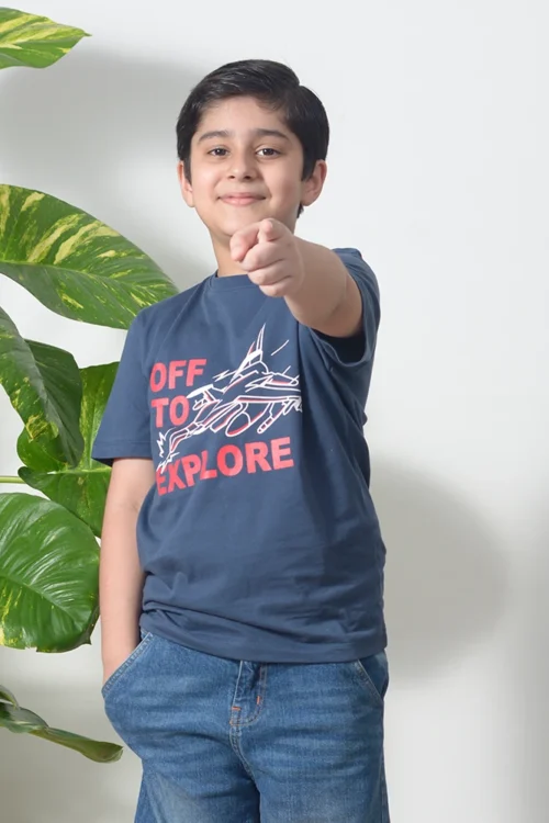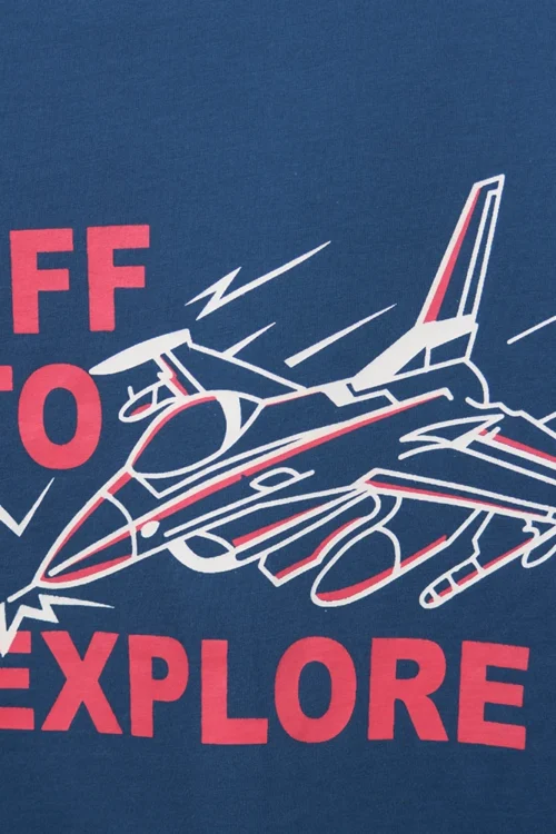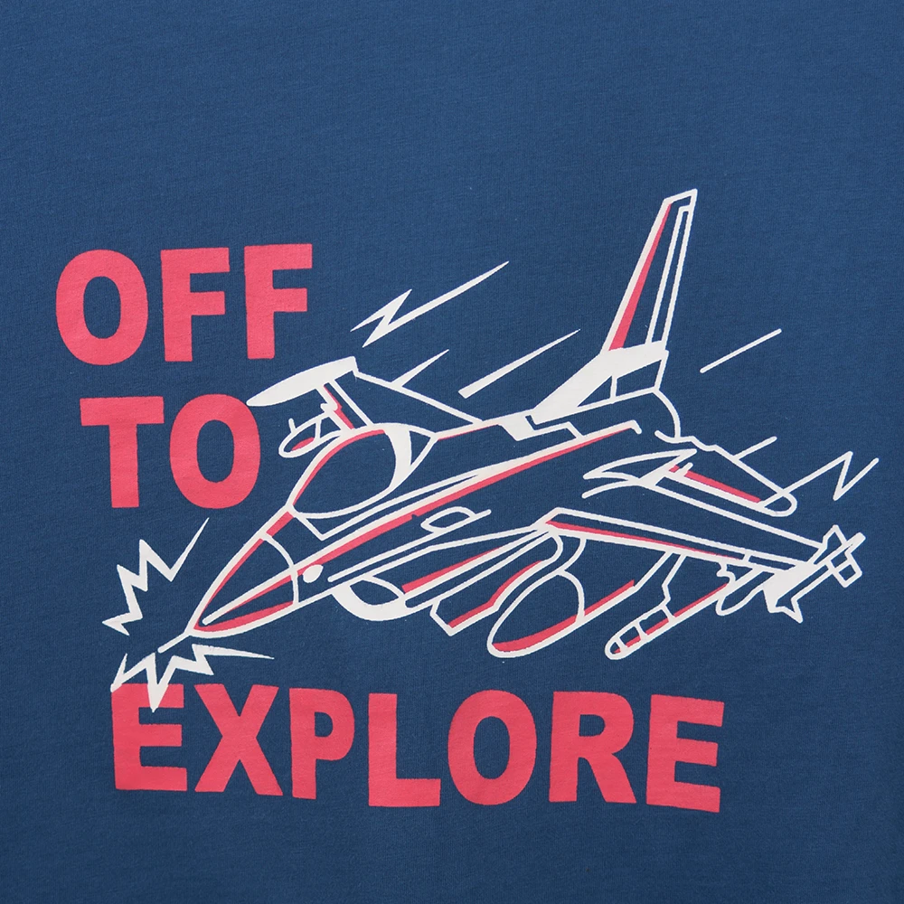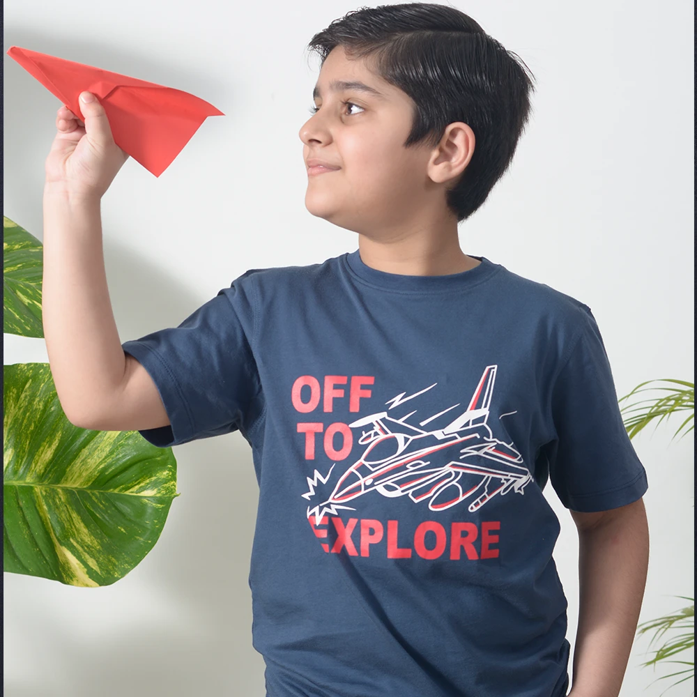 The Jet Plane T-shirt, featuring its bold red “Off to Explore” graphic, is designed for curious kids who dream big and play hard. Crafted from soft, breathable cotton, this navy tee adds a touch of adventure to everyday wear — perfect for travel days, playtime, or casual outings.