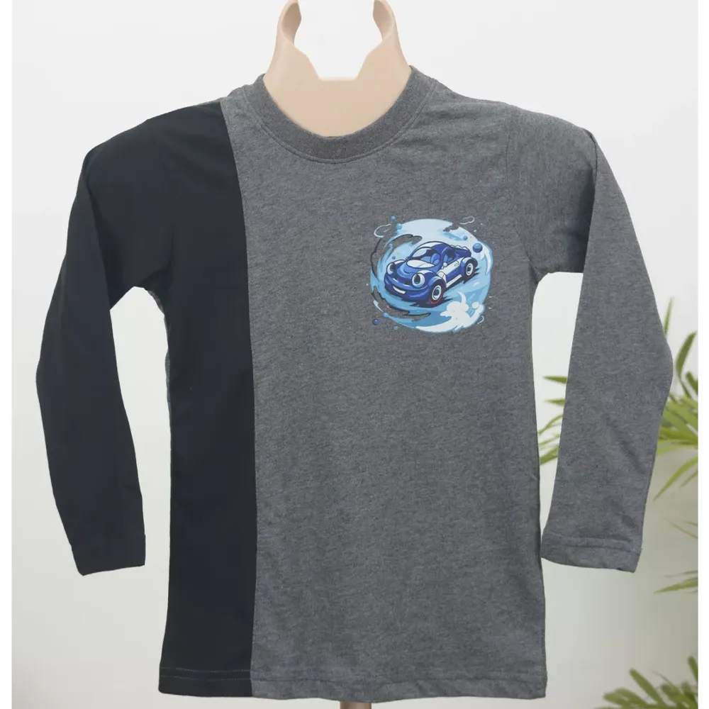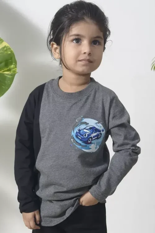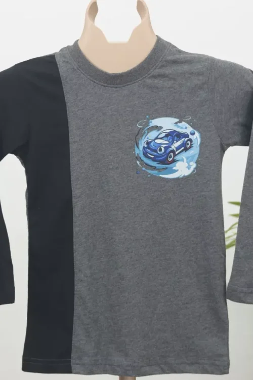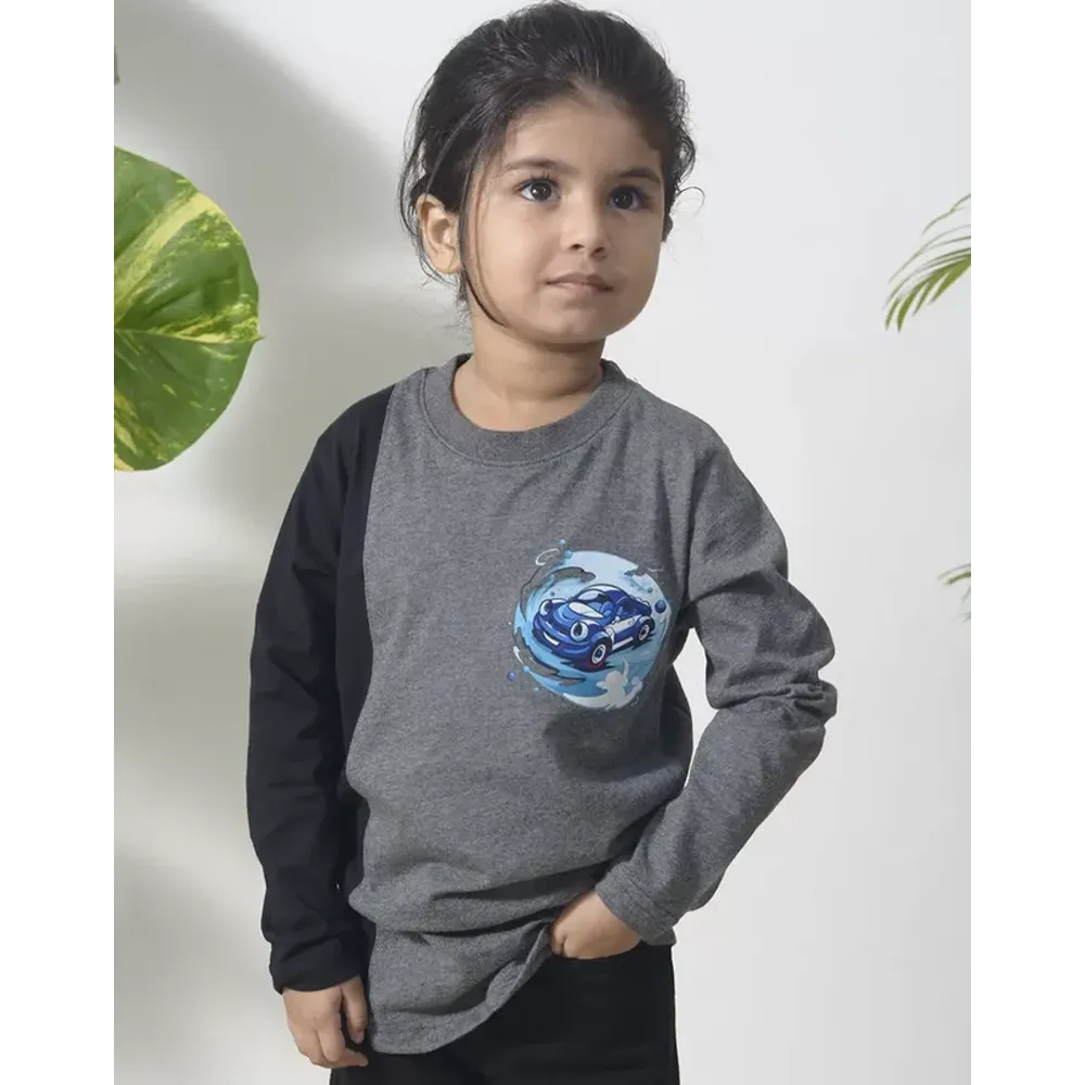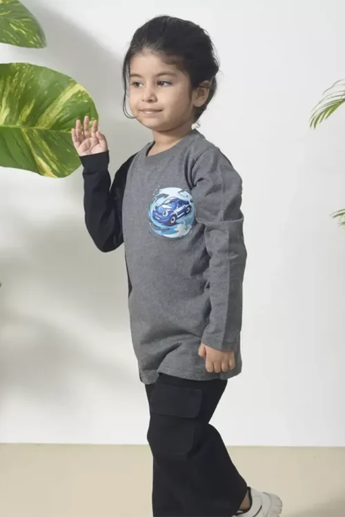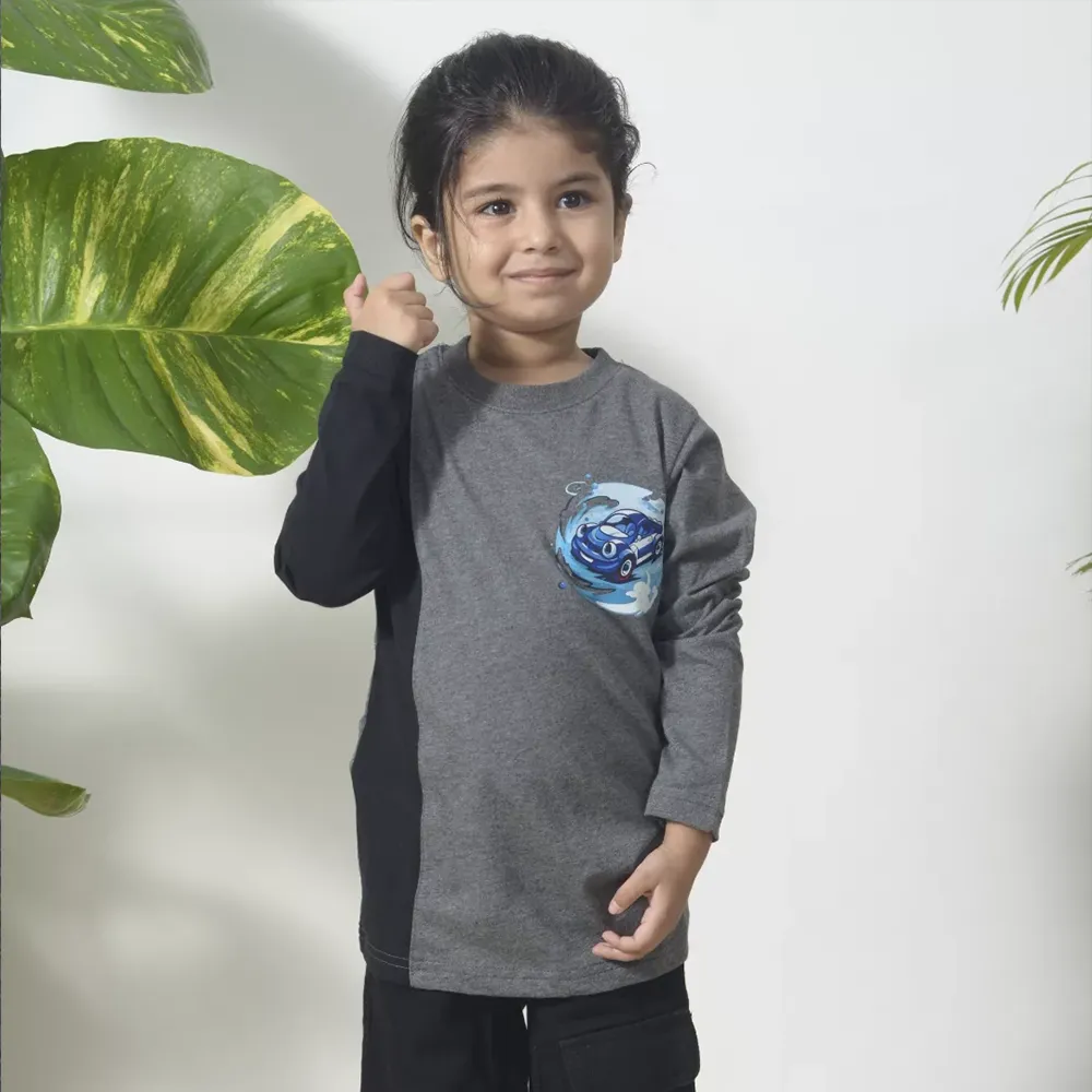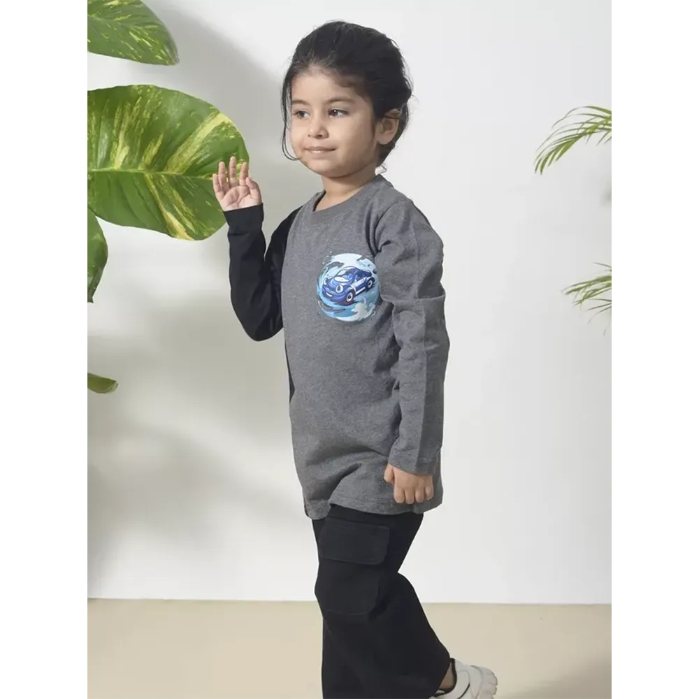 The contrast of grey and black colour-block design adds a trendy touch, while the playful blue car graphic brings fun and personality to the look. Easy to pair with jeans, joggers, or comfy pants, this T-shirt is ideal for playtime, outings, or relaxed days at home.