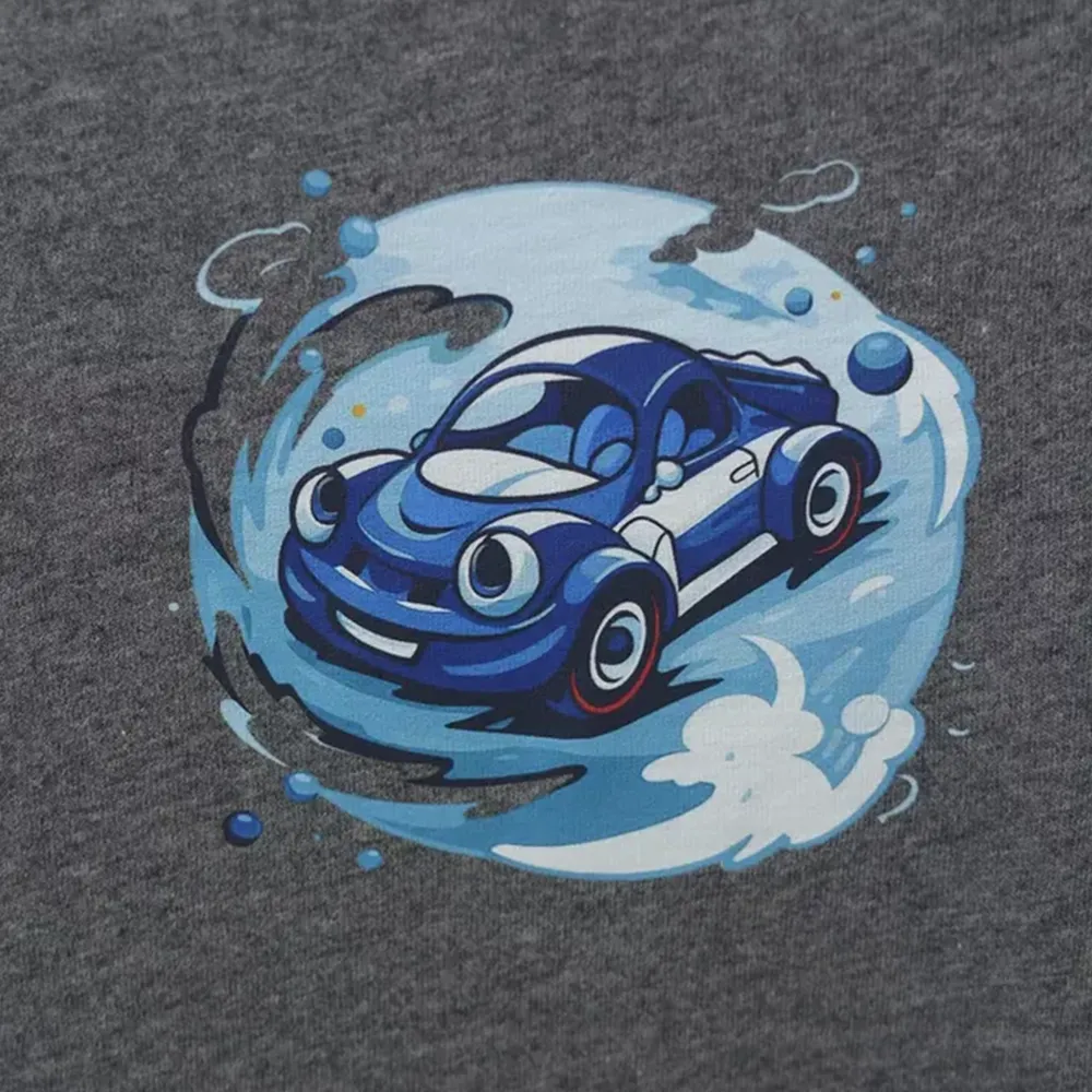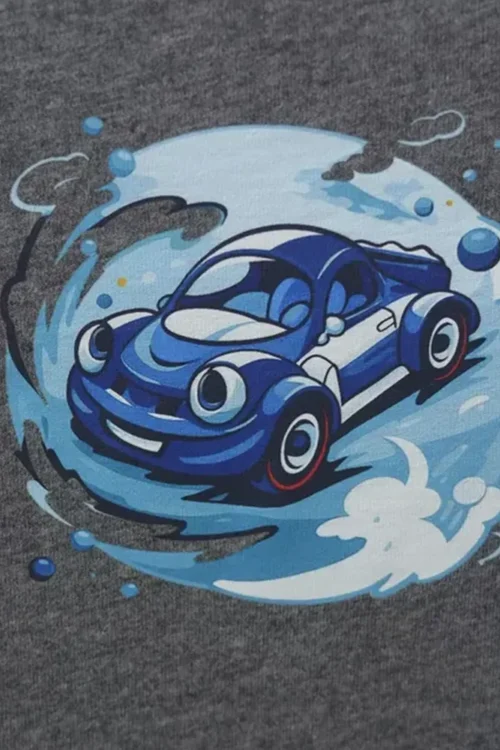 A simple yet stylish grey and black kids’ T-shirt featuring a cool blue car graphic. Made from soft single jersey fabric for all-day comfort and easy movement.