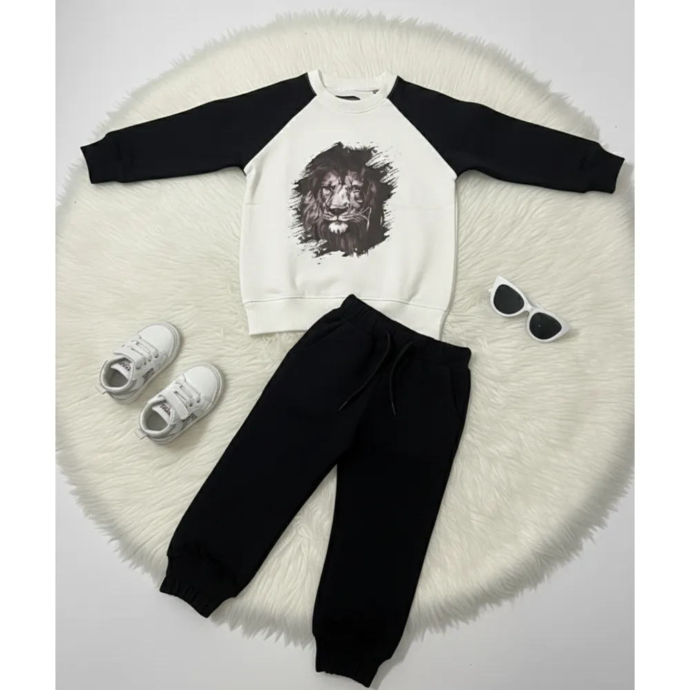 A bold winter look! This Lion Printed Raglan Sweatshirt & Trouser Set features warm fleece, contrast sleeves, and a powerful lion graphic—perfect for ages 3–12.
